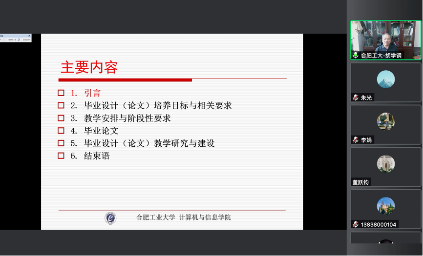 胡学钢教授基于工程教育认证理念,结合毕业设计(论文)全过程,对毕业设计培养目标与相关要求、教学安排与阶段性要求、毕业论文要求、毕业设计(论文)教学研究与建设等内容进行了详细讲解。胡教授强调,毕业设计(论文)是本科教学过程中最重要的实践环节,是检验学生在校学习成果的重要措施。他指出,毕业设计应强化学生综合运用数理知识、专业技术分析和解决复杂工程问题的实际能力。胡教授还针对毕业设计(论文)的教学研究与建设做出具体指导,并就教师能力提升和教师职业发展提出宝贵建议。