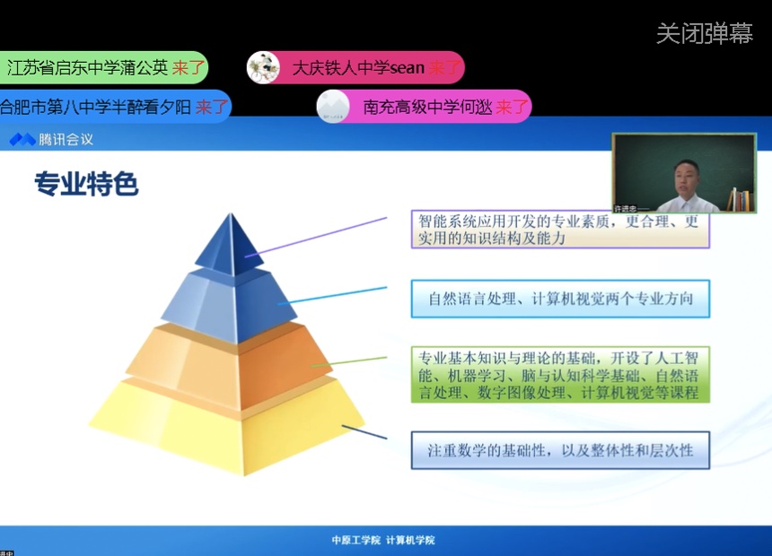 本次招生宣传直播活动分为四个专业专场,计科系主任王海龙以“计算新世界 数字新时代”为主题,网络系副主任张茜以“万物互联 网络为基”为主题、信息安全系副主任单芳芳、骨干教师高丽平以“信息通未来 安全稳天下”为主题,人工智能系副主任许进忠以“人工智能 改变未来”为主题,通过线上直播平台全方位向考生和家长介绍学院概况、专业特色、办学实力以及招生情况、学生就业、学科竞赛等内容,并与考生和家长进行线上互动,在线解答专业及招生等相关问题。精彩的讲解、积极的交流互动给考生们留下了深刻印象。