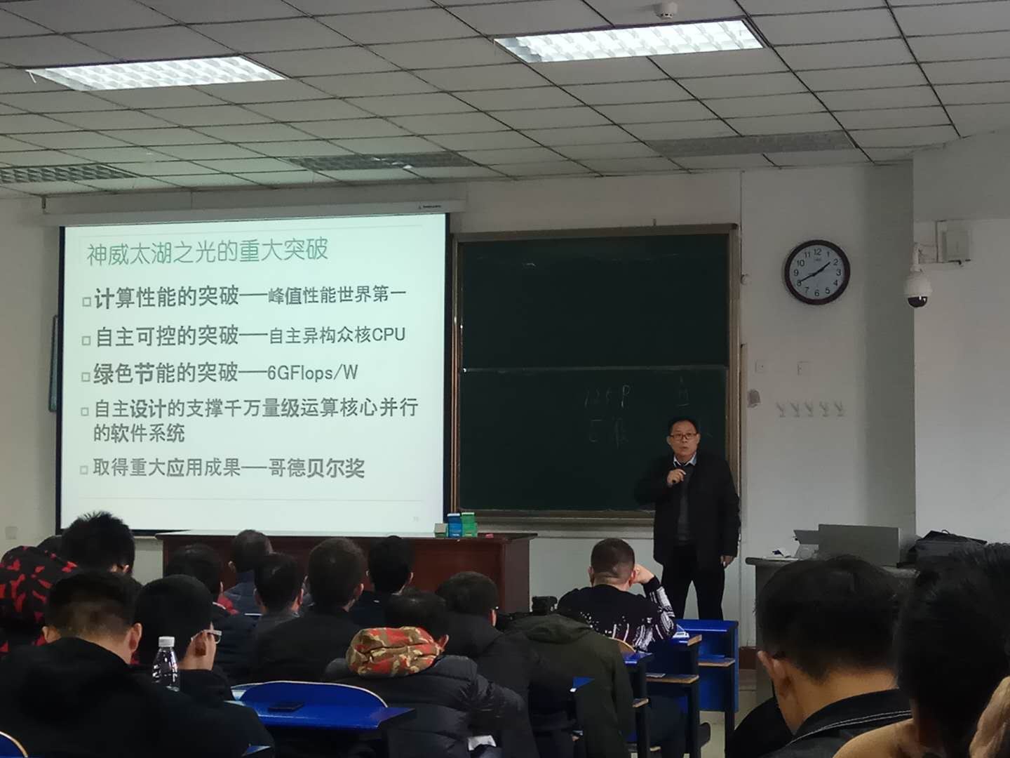 2018年3月20日中午12点半,bat365平台官网特邀赵荣彩教授针对“高性能计算机结构技术发展的创新思维”为全体师生做了精彩的讲座。赵荣彩教授是bat365特聘教授,信息工程大学博士生导师,美国Delaware大学电子与计算机工程系高级访问学者。承担了核高基、国家863、河南省杰出人才创新基金等项目;参研了银河、神威、曙光等超级计算机系统的研制工作。主要研究方向为高性能计算、先进编译技术、程序自动分析、网络安全等。