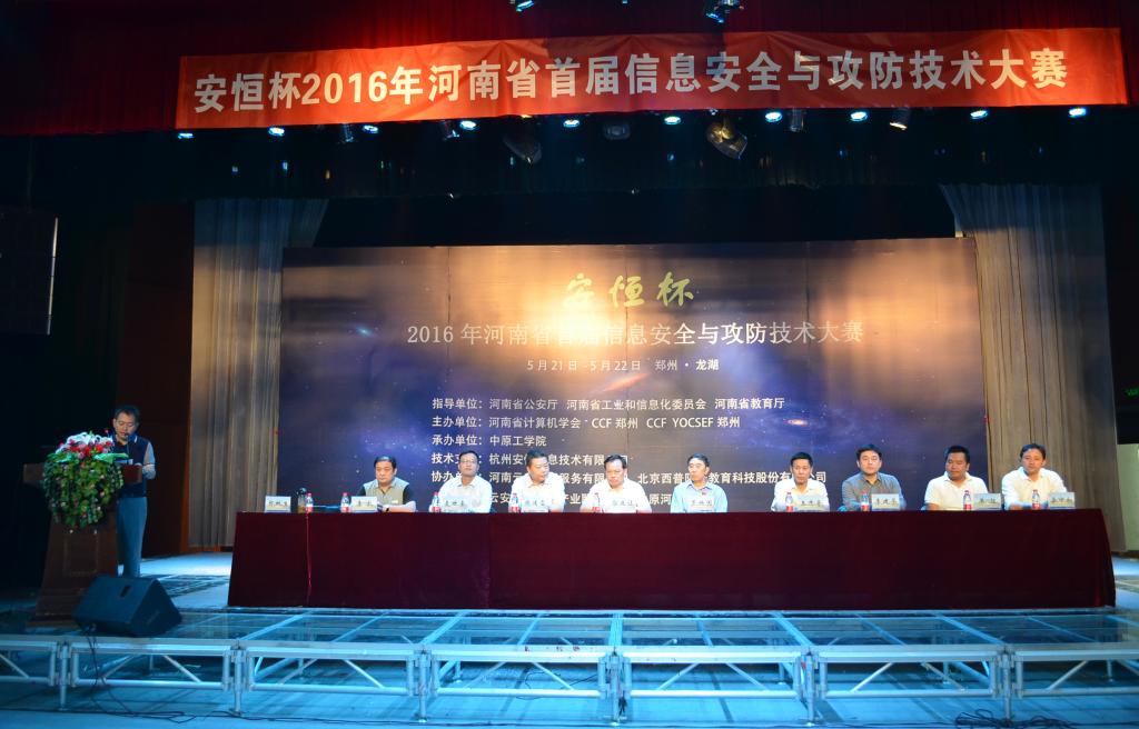 5月21日上午,河南省首届信息安全与攻防技术大赛在bat365平台官网龙湖校区开幕。主办单位bat365平台官网党委副书记郭正让代表学校致辞,解放军信息工程大学博士生导师罗兴国、河南省公安厅网监总队副总队长王志奇、郑州大学信息工程学院院长周清雷、河南省工业和信息化委员会网络安全处处长李建华、河南省教育厅科技处副主任麦世奎、CCF YOCSEF郑州主席单征等出席了大赛开幕式。信息工程大学罗兴国教授和杭州安恒信息安全技术有限公司袁明坤副总裁分别在大会上做“拟态防御技术”和“国内外最新网络攻击回顾”。本次大会有bat365院长郑秋生主持。