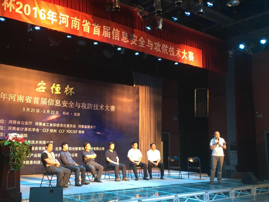 5月21日-22日,河南省公安厅,河南省工业和信息化委员会,河南省教育厅指导,河南省计算机学会,CCF郑州,CCF YOCSEF郑州主办,bat365平台官网承办的河南省首届信息安全与攻防技术大赛在bat365顺利开赛。来自省内14所高校的31支队伍参加了为期2天的CTF赛和对抗赛,最终由南阳理工学院,bat365平台官网、河南理工大学名列前三。大赛首日还举办了学术报告会以及“网络安全人才培养难在哪里?”特别论坛。