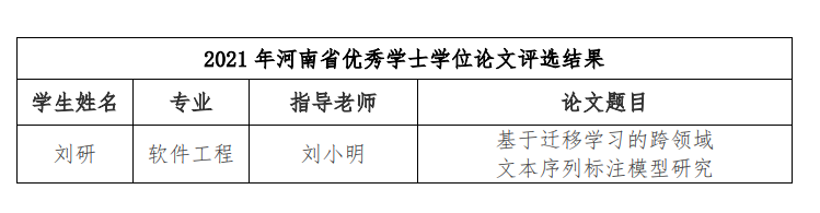 近日,河南省教育厅、河南省学位委员会下发了《关于批准2021年河南省优秀学位论文的决定》(教研〔2022〕295 号)文件,bat365教师刘小明指导的《基于迁移学习的跨领域文本序列标注模型研究》被评为河南省优秀学士学位论文。