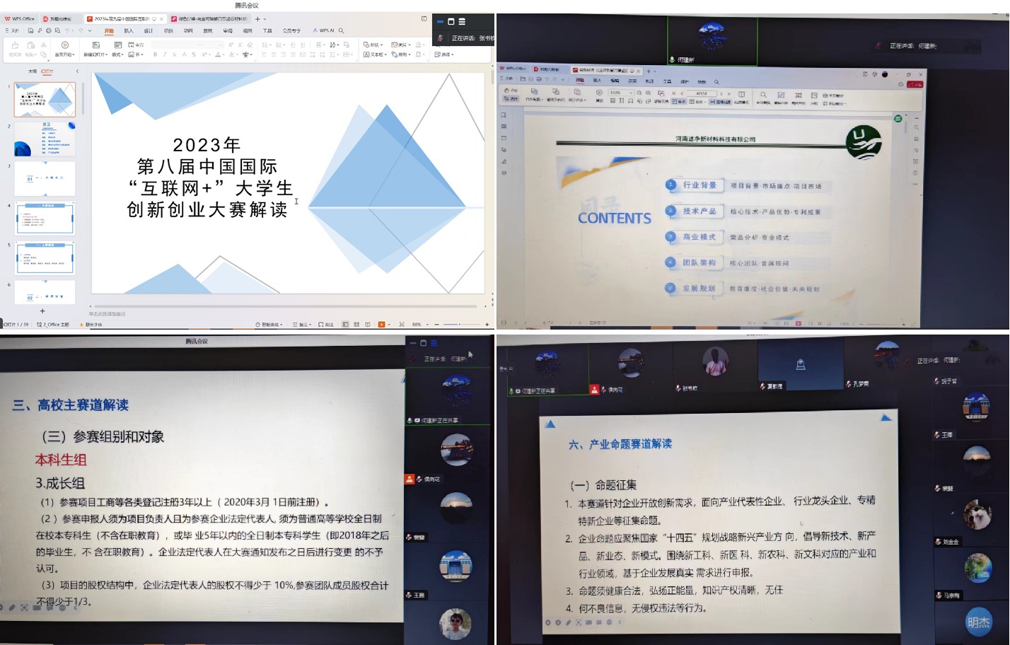为切实推进bat365“互联网+”“挑战杯”等大学生创新创业赛事工作高质量开展,提升学院师生创新创业大赛参赛能力和水平。2024年2月5日晚,bat365平台官网邀请了 “互联网+”“挑战杯”等大赛国赛获奖项目优秀指导老师——bat365纺织服装产业研究院何建新教授进行创新创业赛事线上辅导讲座,bat365六十多名老师参加了报告会。
