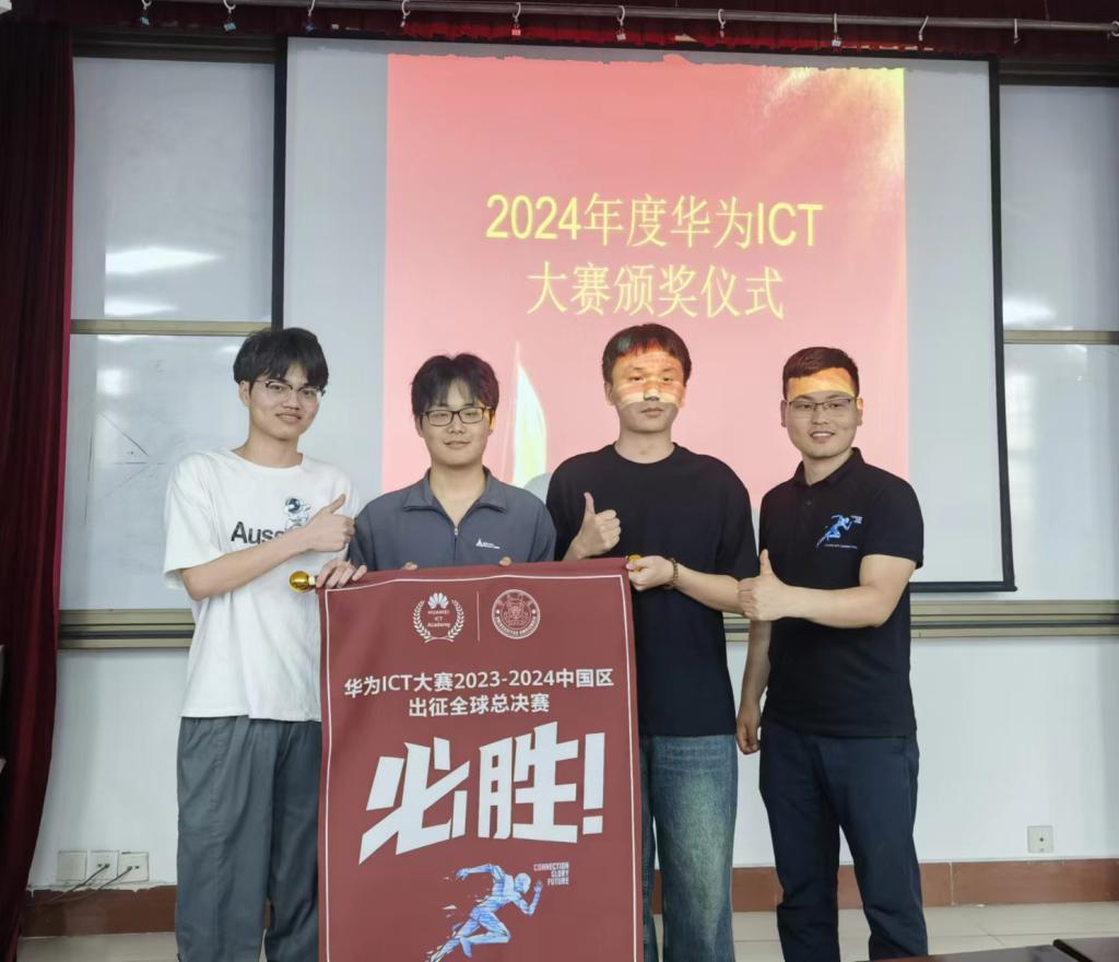 近日,华为ICT大赛2024实践赛本科组中国区总决赛在郑州华为办事处分赛场成功举行。bat3652020级网络工程专业本科生李金坤、贾鑫龙、王文博组成的参赛队伍最终进入本科组全国前八名,荣获全国赛二等奖并入围全球赛!这是bat365学生首次实现国家级奖项的突破、刷新了该项赛事的历史获奖记录!为激励入围全球赛,华为公司专门为获奖队伍制作了出征战旗,4月26日,bat365召开华为ICT大赛颁奖暨授旗仪式,学院副院长王佩雪为获奖队员颁发了奖品及奖杯,华为人才发展部孙星星经理为队员授旗。