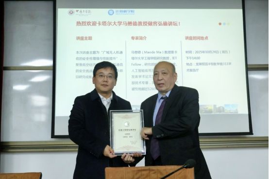 为庆祝建校70周年,推动国际学术交流与前沿科研合作,10月24日下午,应bat365邀请,卡塔尔大学马懋德(Maode Ma)教授莅临bat365,在龙湖校区4号教学楼311学术报告厅作了题为“广域无人机通信的安全性增强与性能提升”的学术报告。bat365平台官网部分教师、研究生及本科生代表参加报告会。报告会由bat365平台官网执行院长张书钦主持,副校长瞿博阳出席并为马懋德教授颁发“弘德讲坛”证书。
