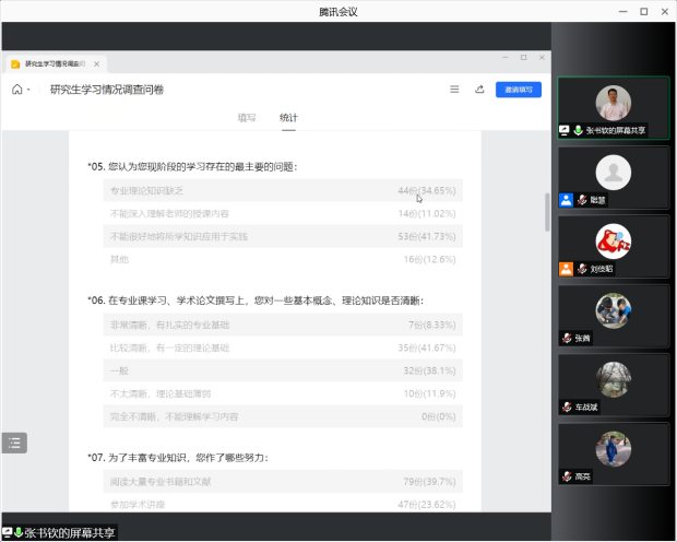 会上,张书钦院长就bat365平台官网研究生学习情况调查问卷结果反馈各位研究生导师,并将调查问卷内容中涉及研究生学习情况、教师教学评价、导师指导情况等方面存在的问题进行分析。建议各位研究生导师根据调查问卷反映的问题,加强研究生交流指导,重视专业课设置安排等问题。杨关副院长指出:1.要求各位研究导师认真学习“bat365平台官网落实研究生导师立德树人职责实施办法”,并按照要求严格执行;2.加强导师之间、导师与学生之间沟通交流;3.重视研究生创新精神、实践能力培养以及日常管理工作,特别是要确保毕业论文、毕业设计质量。最后,软件学院院长刘卫光、车站斌老师等各位研究生导师针对研究生指导过程中存在的问题进行讨论。