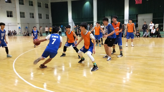 哨声响起,双方队员为了争夺球权都拼尽全力,第一次球权由我方高翔队员抢到,我方队员迅速组织进攻,但是因为对方干扰而导致球权易手。队员们个个拼抢用心,在对方球员投篮不中以后,我方队员摘下后场篮板并迅速传给王昊天向前场推进,王昊天到达三分线以后没有任何犹豫,顶着对方防守球员三分发炮,篮球精准的进入篮筐,我方球队取得本场比赛第一个进球。之后场面一度陷入僵持,在篮下对方球员进攻时造成我方球员犯规,对方依靠稳稳地罚球扳平比分。随后一次进攻,我方王昊天队员运球直插篮下,闪转腾挪,面对对方三名防守球员,扭曲着身体打进一球,强势造成二加一,并稳稳地罚球命中,没有浪费这次打三分的机会。然而对方的传球方式和攻防体系让我方球员打着有些吃力。随后中场选手替换时,我方林思宇队员制造投篮空间,用一记漂亮的三分球拉近比分,引得阵阵欢呼。面对对方球员的防守压制,我方球员顶住压力发出反击,王五一、王昊天在外线多次送出精准助攻,利用对方防守漏人的机会,帮助我方内线球员完成得分。场外的同学为参与比赛的运动员打气、喝彩,使得场内充满激情,气氛空前高涨!