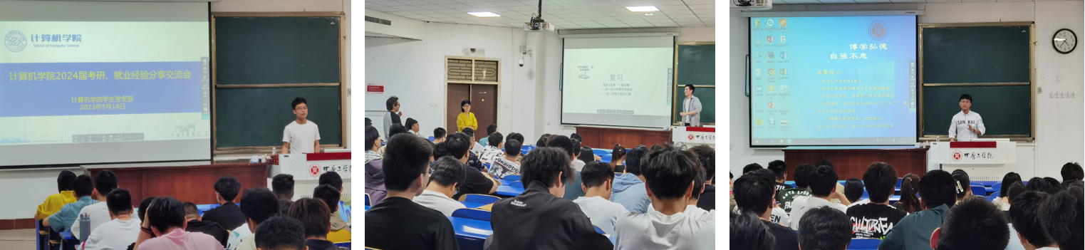 分享会上,拟录取西安电子科技大学研究生的赵昊宾同学,开篇以做充足准备同时量力而为的考研备考原则开始他的分享,着重从初试备考、报考择校、复试要点做了详细分析和讲解。学生党员李阿东结合自身学习、工作、求职经历,从求职准备、面试心得等方面进行经验分享,再次强调,求职更要提前规划,从专业知识到实践能力乃至综合素质的的全面准备,积极尝试总结改进是每次求职应聘后的必修课,另外也针对求职找工作中的误区和陷阱进行了例举提醒。两位党员学长分享之后,侯老师进行总结,结合目前互联网行业严峻就业形势、23届学生考研就业分析,建议24届学生根据自身优势特长合理规划职业发展,早规划早准备,积极行动,重视学校资源,全力以赴实现一战上岸和顺利就业。