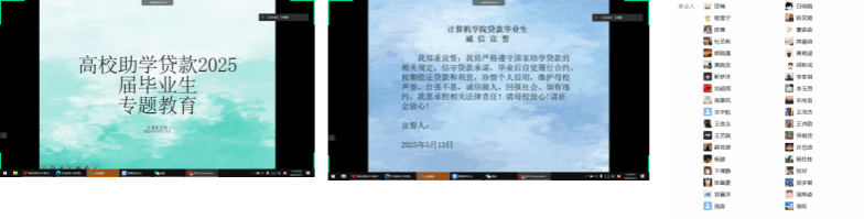 会上,于老师围绕毕业确认、还款规范、信用责任三大模块展开讲解:详细讲解如何进行还款;通过支付宝还款案例,说明“在线还款”步骤及逾期产生的征信影响、法律责任;结合“注销校园贷”诈骗案例,警示学生警惕金融陷阱,妥善保管贷款合同。