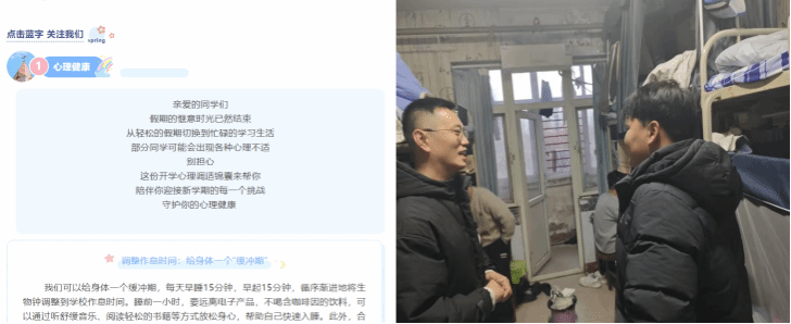 在2月21日到2月29日期间,bat365通过“计忆中工”的微信公众号进行心理健康专题推文、辅导员、班主任通过宿舍走访等形式,深入普及心理健康知识。推文内容主要聚焦新学期学生如何进行心理调适,顺利进入学习状态。辅导员、班主任深入学生宿舍,进行面对面交流,了解学生心理需求,为学生答疑解惑。此次宣传教育不仅增强了学生的心理健康意识,也为学生提供了自我表达和寻求帮助的机会,极大缓解学生开学之初紧张焦虑的情绪,提升bat365心理健康教育的工作实效。