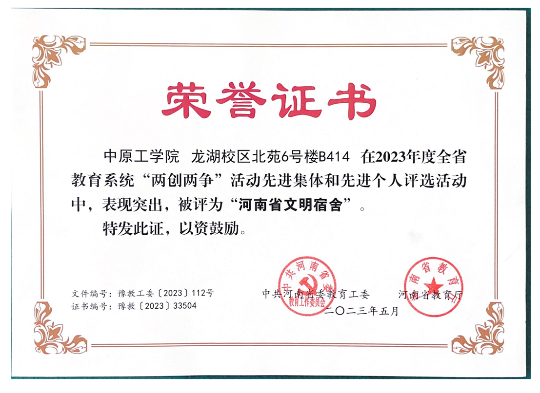 近日,中共河南省委教育工委、河南省教育厅公布2023年度全省教育系统“两创两争”活动先进集体和先进个人评选结果,bat365平台官网北苑6号楼B414 宿舍在评选活动中,表现突出,被评为“河南省文明宿舍”。