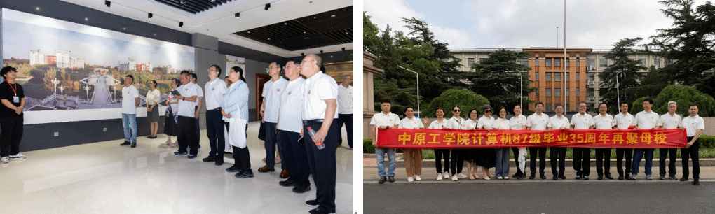 在返校聚会活动中,校友们参观游览中原校区,在校园和主教楼前集体合影留念。校友们集体参观龙湖校区校史馆,通过珍贵史料和影像,重温青春记忆,对学校取得的成就深感自豪,对70周年校庆、未来发展充满期待和祝福。(通讯员 侯向花 摄影 魏宸浩)